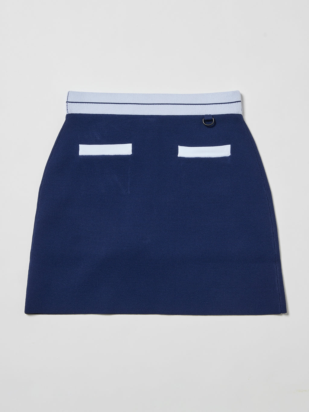 台形シンプル形にウエストゴム部分にロゴとラインが印象的なデザイン。