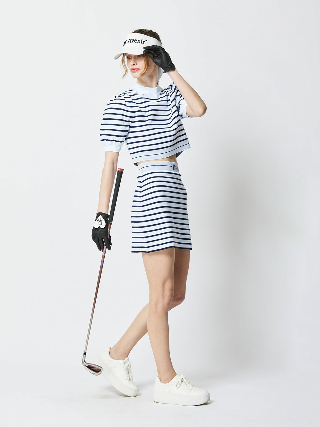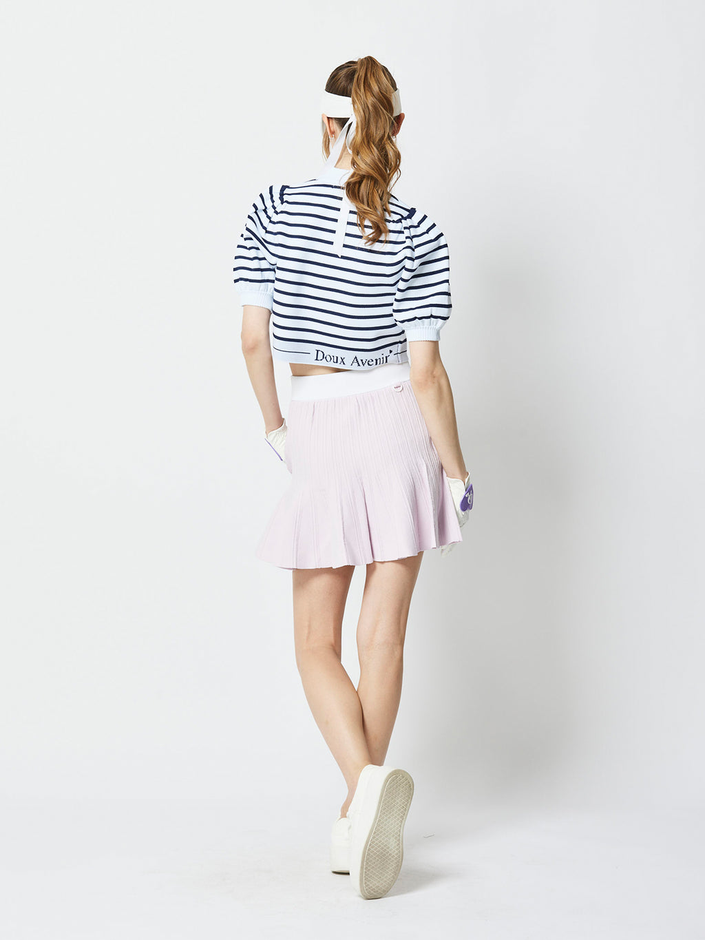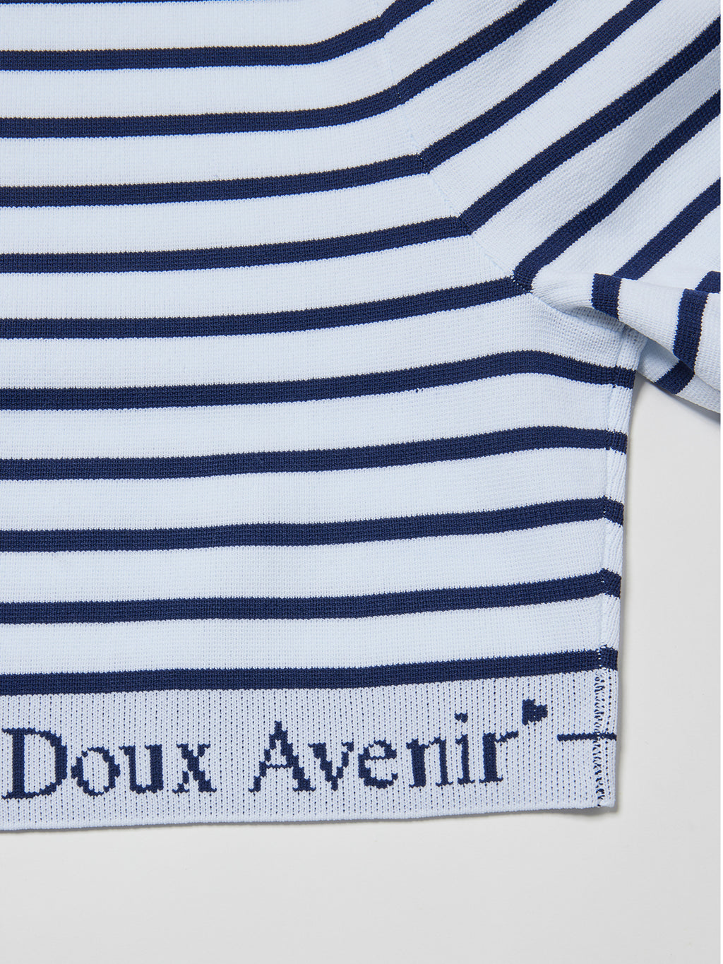 サマーニット生地でありながら体型を拾いにくくちょうどよい厚さのある生地。スカートとセットアップで着用するとウエストロゴが見えて可愛いアイテム。